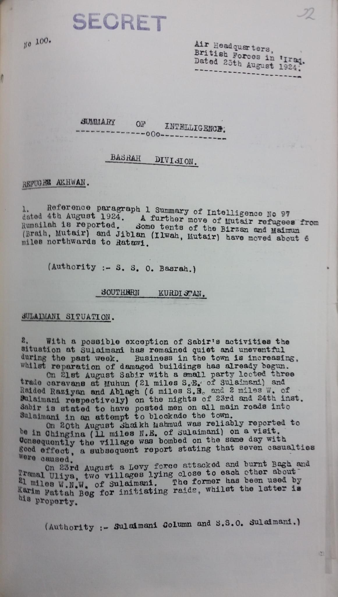 رەنجدەر شێرزاد بارەگای ئاسمانی، هێزەکانی بەریتانیا لە عێراق، لە بەرواری ٢٥ی ئابی ١٩٢٤ ژمارە: ١٠٠، نهێنی. پوختەی زانیاری هەواڵگری. مقاتەعەی بەسرە. پەناگەی ئیخوان. ئاماژە بە بڕگەی ١ی پوختەی زانیاری هەواڵگری ژمارە ٩٧ لە بەرواری ٤ی ئابی ١٩٢٤. گواستنەوەی زیاتری پەنابەرانی موتەیر لە ڕومەیلە باس کراوە. هەندێک لە خێمەکانیبرزان و مەیمون (برایح، موتەیر) و جیبلان لە دووری نزیکەی ٦ میل بەرەو باکوور بەرەوڕەتاوی ڕۆیشتوون. (دەسەڵات: بەسرە ئەفسەری پشکنەری سیاسی) *** باشووری کوردستان. بارودۆخی سلێمانی. جگە لە ئەگەری چالاکییەکانی سابیر (کوڕی کەریمی فەتاح بەگی هەمەوەند) بارودۆخیسلێمانی لە ماوەی هەفتەی ڕابردوودا بێدەنگ و پڕ ڕووداو بووە. بازرگانی لەشارۆچکەکەدا لە زیادبووندایە، ئەمە لە کاتێکدا لە ئیستاوە چاککردنەوەی بینازیانلێکەوتووەکان دەستیپێکردووە. لە ٢١ی ئاب سابیر لەگەڵ گروپێکی بچووک، سێ کاروانی بازرگانییان لە هوانە لە دووری٢١ میل لە باشووری ڕۆژهەڵاتی سلێمانی بردو و لە شەوانی ٢٣ و ی٢٤ مانگداهەڵیانکوتایە سەر ڕازیان و ئابڵاغ لە دووری ٦ میل لە باشووری ڕۆژهەڵات و ٢ میل لەڕۆژئاوای سلێمانی. باس لەوە دەکرێت کە سابیر پیاوی لەسەر هەموو ڕێگاسەرەکییەکانی ناو سلێمانی داناوە لە هەوڵدایە بۆ گەمارۆدانی شارۆچکەکە. لە ٢٠ی ئابدا بە شێوەیەکی باوەڕپێکراو ڕاپۆرت هاتوە کە شێخ مەحمود لە سەردانێکدا لەچنگنیان بووە لە دووری ١١ میل لە باکووری ڕۆژهەڵاتی سلێمانی. لە ئەنجامدا لە هەمانڕۆژدا گوندەکە بۆردومان کرا و کاریگەرییەکی باشی هەبوو (واتە بە پێی ڕاپۆرتەکەکاریگەری باشی بۆ بەریتانیا هەبووە بەوپێیەی زیانیان گەیاندوە بە خەڵکی گوندەکە)،ڕاپۆرتێکی دواتر باسی لەوە کردوە کە بۆردومانەکە حەوت قوربانی لێکەوتووەتەوە. لە ٢٣ی ئاب هێزێکی لیڤی هێرشیان کردە سەر باخ و تیمار ولیان دوو گوندی نزیک لەیەکو سووتاندیان (لێرەدا هەردوو گوندی تیمار و ولیانی وەک یەک گوند باس کردوە لەکاتیکدا دوو گوندی جیابوون)، لە دووری نزیکەی ٢١ میل لە ڕۆژئاوای باکووری ڕۆژئاوایسلێمانیەوە. یەکەمیان لەلایەن کریمی فەتاح بەگەوە بۆ دەستپێکردنی هەڵمەتەکانبەکارهێنراوە، لەکاتێکدا دووەمیان موڵکی خۆیەتی. (دەسەڵات: یەکەی سلێمانی و ئەفسەری پشکنەری سیاسی. سلێمانی) *****